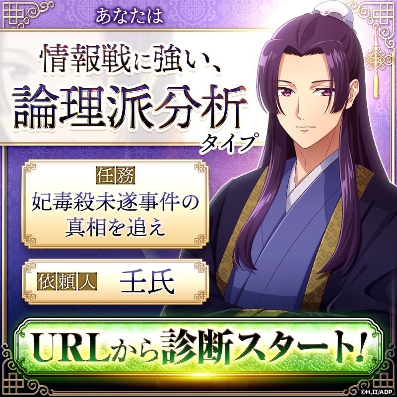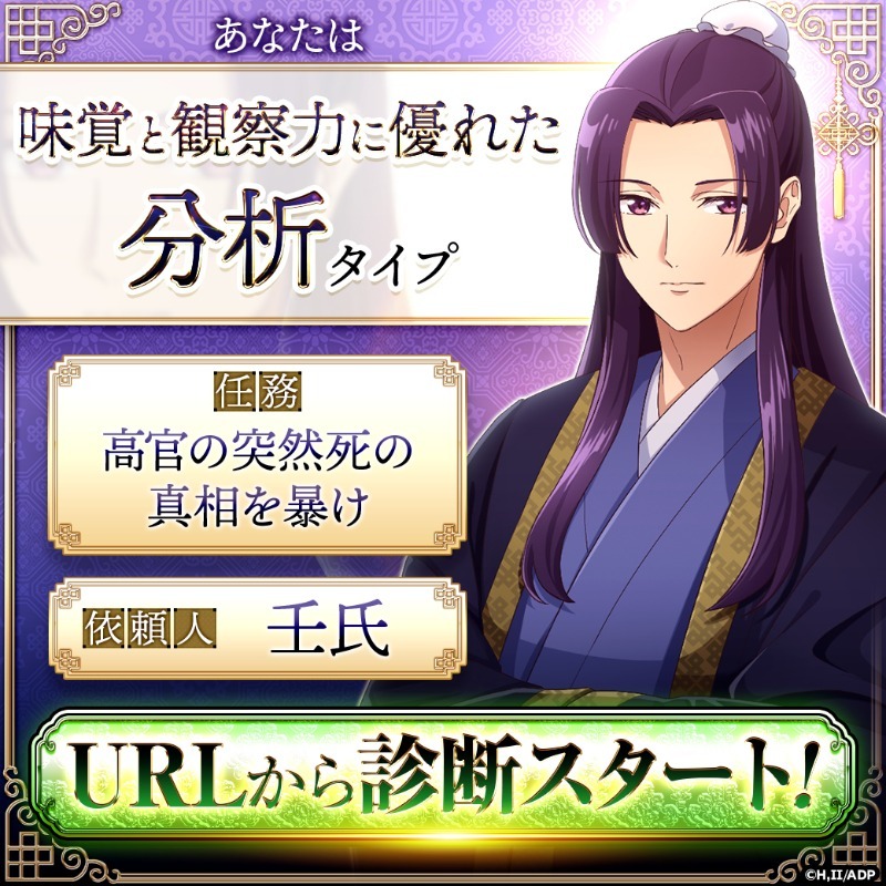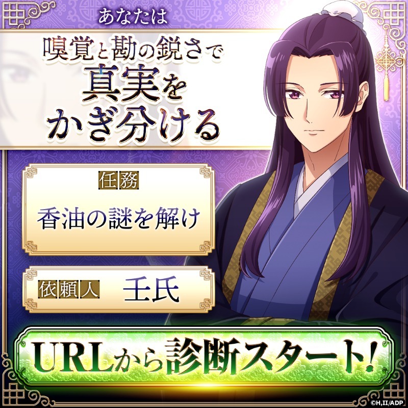 #薬屋異聞録 #薬屋任務診断 私は依頼人「壬氏」から、任務「香油の謎を解け」を任されました! ▼事前登録はこちら s.g123.jp/mhuy3fsg ▼みんなも診断してみてね! lin.ee/leezHvT pic.x.com/xii1lFwzaM