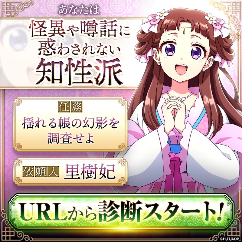 #薬屋異聞録 #薬屋任務診断 私は依頼人「里樹妃」から、任務「揺れる帳の幻影を調査せよ」を任されました! ▼事前登録はこちら s.g123.jp/mhuy3fsg ▼みんなも診断してみてね! lin.ee/leezHvT pic.x.com/PjmPXUruIP