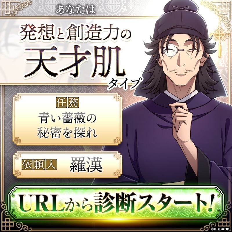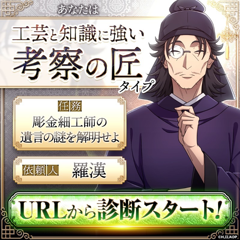 #薬屋異聞録 #薬屋任務診断 私は依頼人「羅漢」から、任務「彫金細工師の遺言の謎を解明せよ」を任されました! ▼事前登録はこちら s.g123.jp/mhuy3fsg ▼みんなも診断してみてね! lin.ee/leezHvT pic.x.com/nM0z33dNe5
