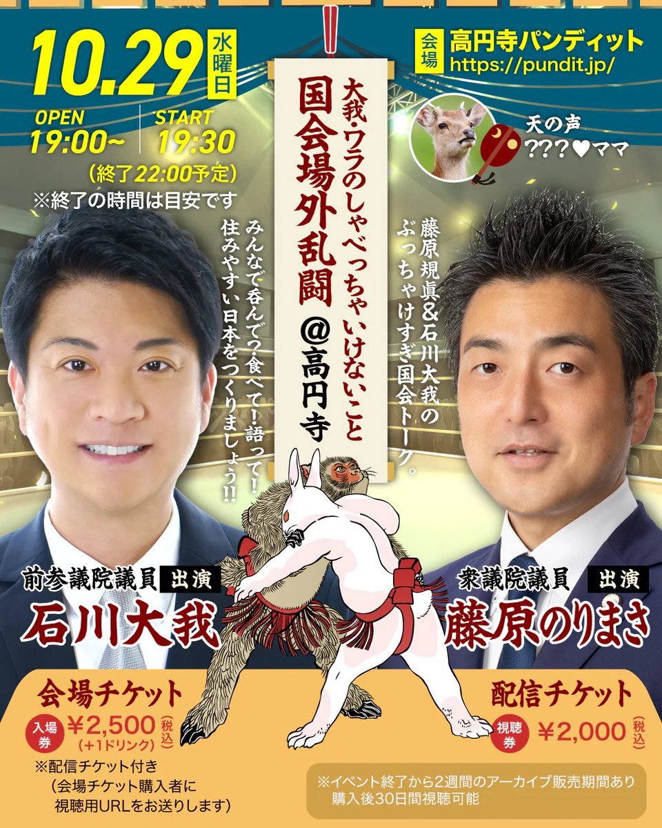 予測不能!? 現職&元職の国会議員が政界のリアルをぶっちゃけトーク! 10月29日(水)19:30~ 「大我・ワラのしゃべっちゃいけないこと 国会場外乱闘@高円寺」 出演:石川大我(前参議院議員)、藤原のりまさ(衆議院議員) @ishikawataiga @CDP_AICHI10 詳細はこちら↓ pundit.jp/products/25p1-…