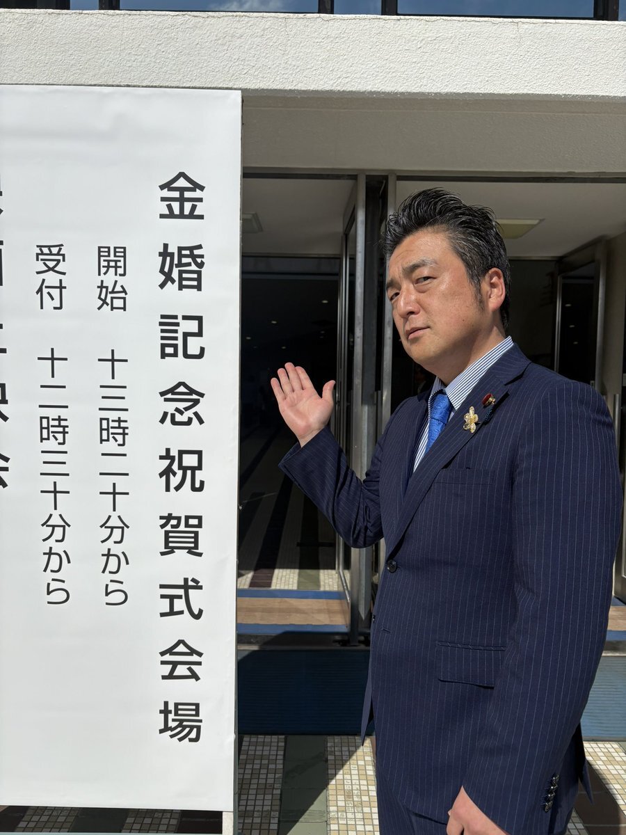 一宮市金婚記念祝賀式✨ 本日のファッションポイントは 金婚に合わせて 金色のお花のブローチです🏵️ #藤原のりまさ pic.x.com/CDEvscAaRL