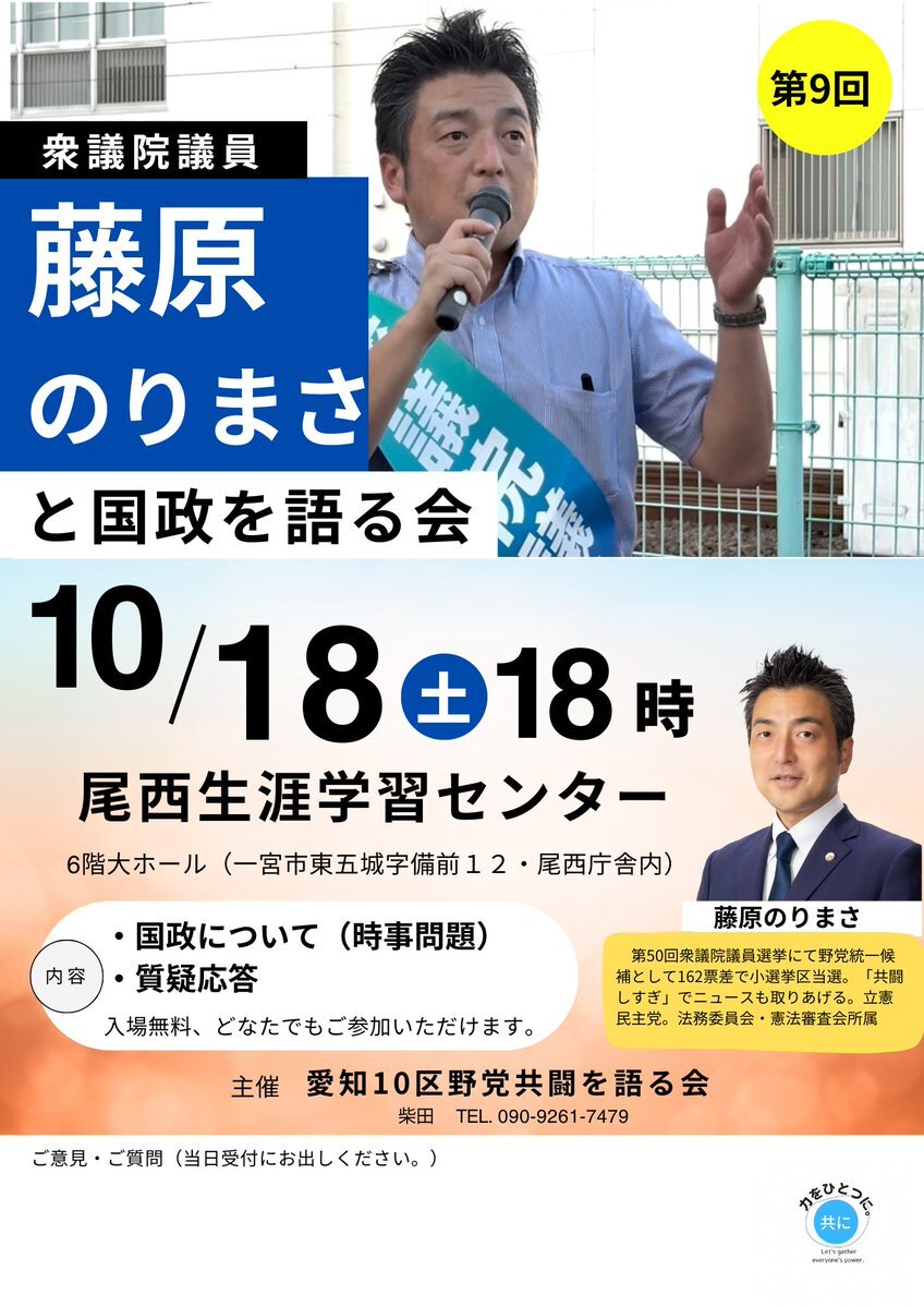 10月の国政を語る会は 10/18(土)18時から 尾西生涯学習センターにて📖 会場でお待ちしてます! #藤原のりまさ