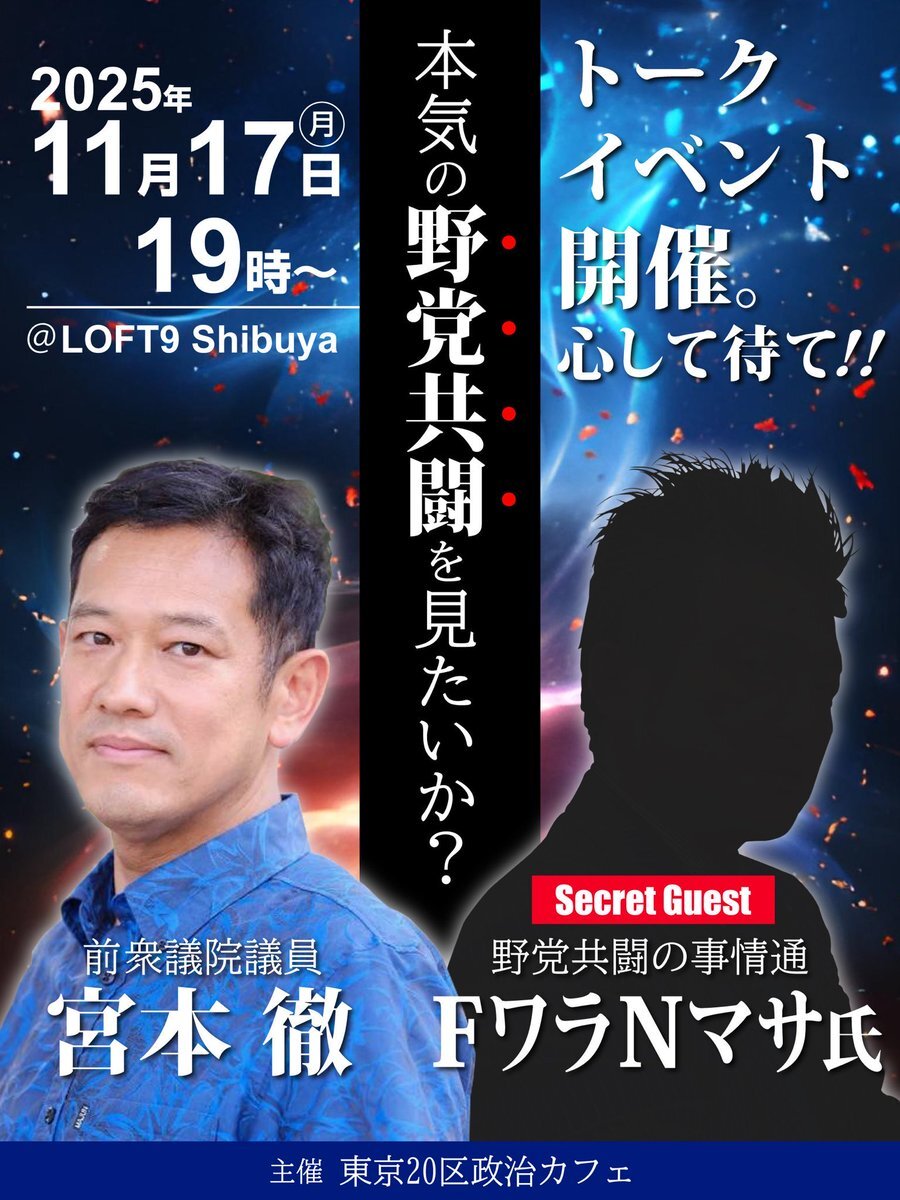 ゲストは藤原のりまさ衆議院議員(@CDP_AICHI10)。 #宮本徹 (@miyamototooru)と初対談です。 11月17日(月)19時より、LOFT9Shibuyaにて。 ご期待ください。 x.com/tokyo20activis…