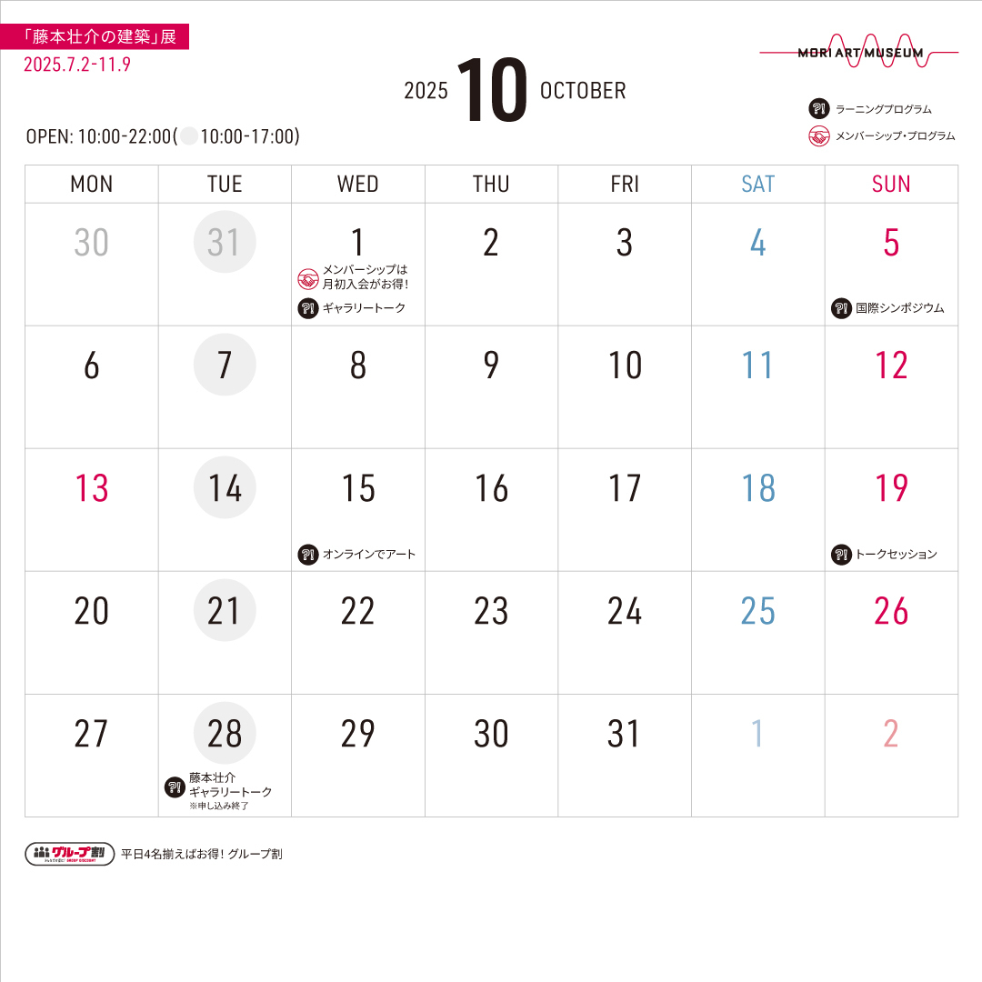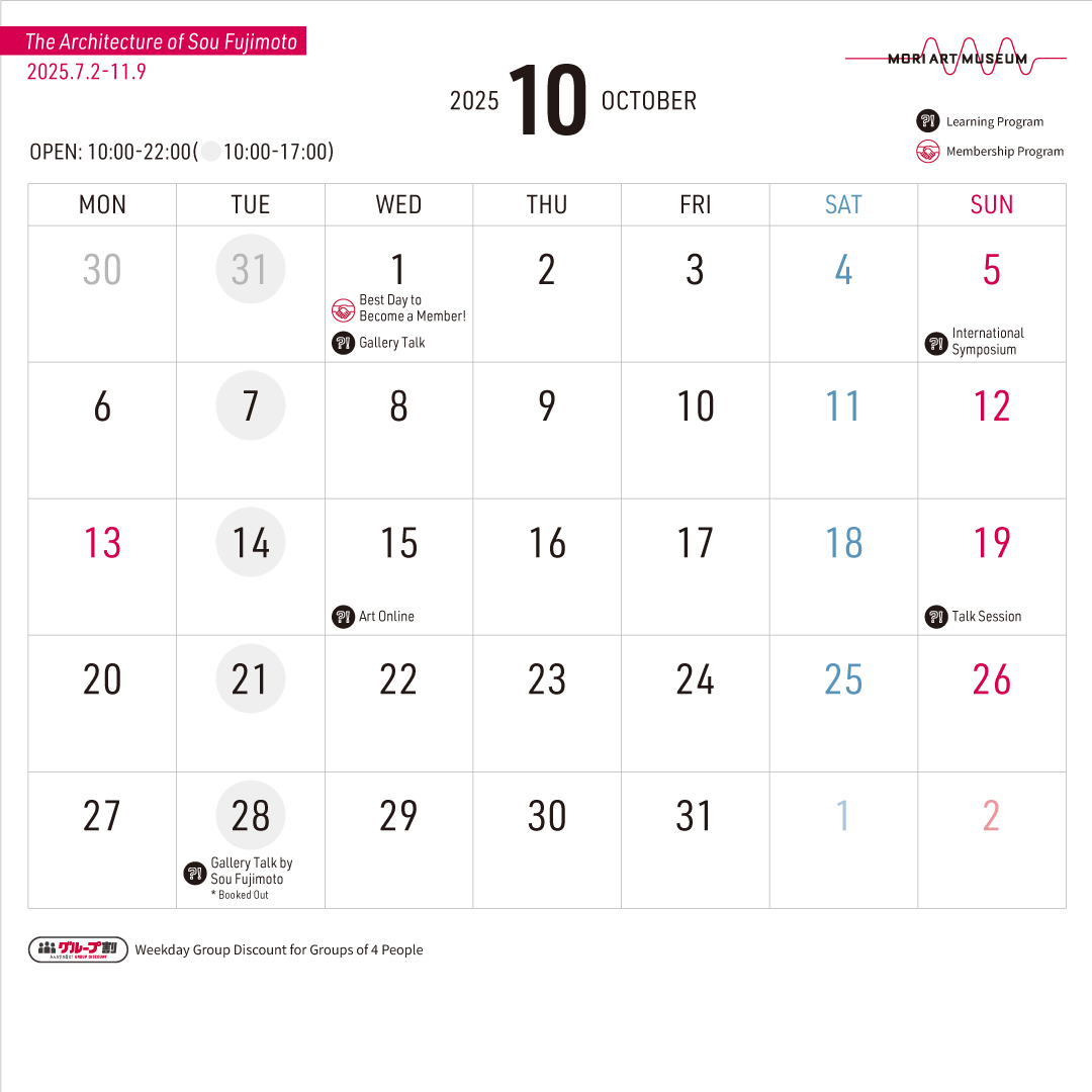 【本日10/14(火)は17:00まで】 森美術館は毎週火曜日、17:00閉館(16:30最終入館)です。 ※火曜以外は22:00まで開館 The Mori Art Museum is closed at 5 p.m. today! * Admission until 30 minutes before closing. * Open until 17:00 on Tuesdays. #藤本壮介展 #藤本壮介の建築 #SouFujimoto pic.x.com/m1BHp7fo1a