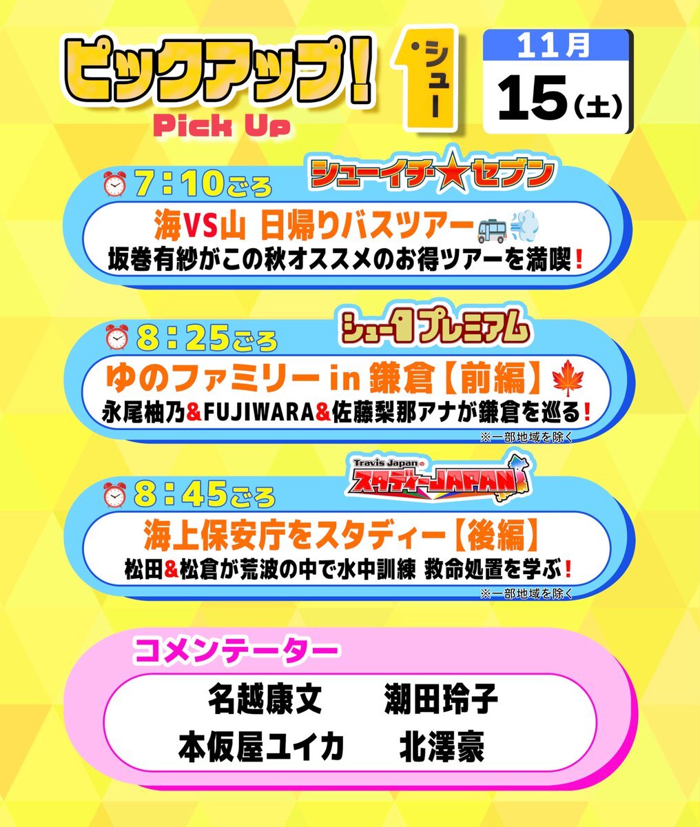 / 明日の〖 シューイチ土曜 〗は… \ ⏰毎週土曜あさ𝟱時𝟱𝟱分〜𝟵時𝟮𝟱分放送 ☝🏻ぜひ見てね! #坂巻有紗 (@alisa2525_10923) #永尾柚乃 #FUJIWARA (@fujiwara_mg) #原西孝幸(@FUJIWAR44916965) #藤本敏史 #佐藤梨那 アナ 🐯#TravisJapan (@TravisJapan_cr) 💙#松田元太🧡#松倉海斗 #名越康文 pic.x.com/rWZ7j13Fqv