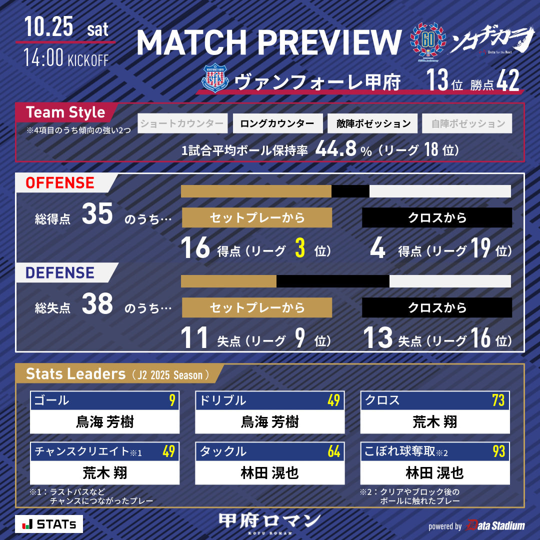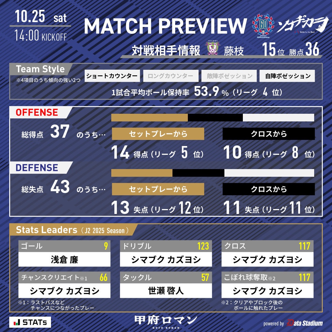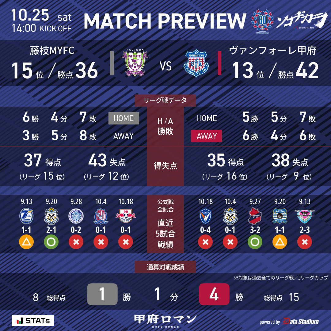 📊データプレビュー 🏆明治安田J2リーグ 第34節 🆚#藤枝MYFC 🗓 10/25 14:00キックオフ 🏟#藤枝総合運動公園サッカー場 #ヴァンフォーレ甲府 #vfk #ソコヂカラ pic.x.com/6VKlwSMGLg