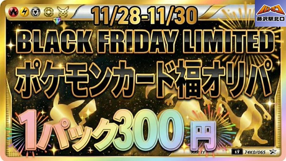 🔥BLACK FRIDAY LIMITED🔥 ブラックフライデー第1️⃣弾 ただ今より、レジ前にて ⚡️#ポケモンカード⚡️ 福オリパの販売を開始いたします🔥 ✨1パック3️⃣0️⃣0️⃣円✨ ※なくなり次第終了です #フジロコ #バトロコ #藤沢 #ブラックフライデー pic.x.com/HhSKs3J0iT