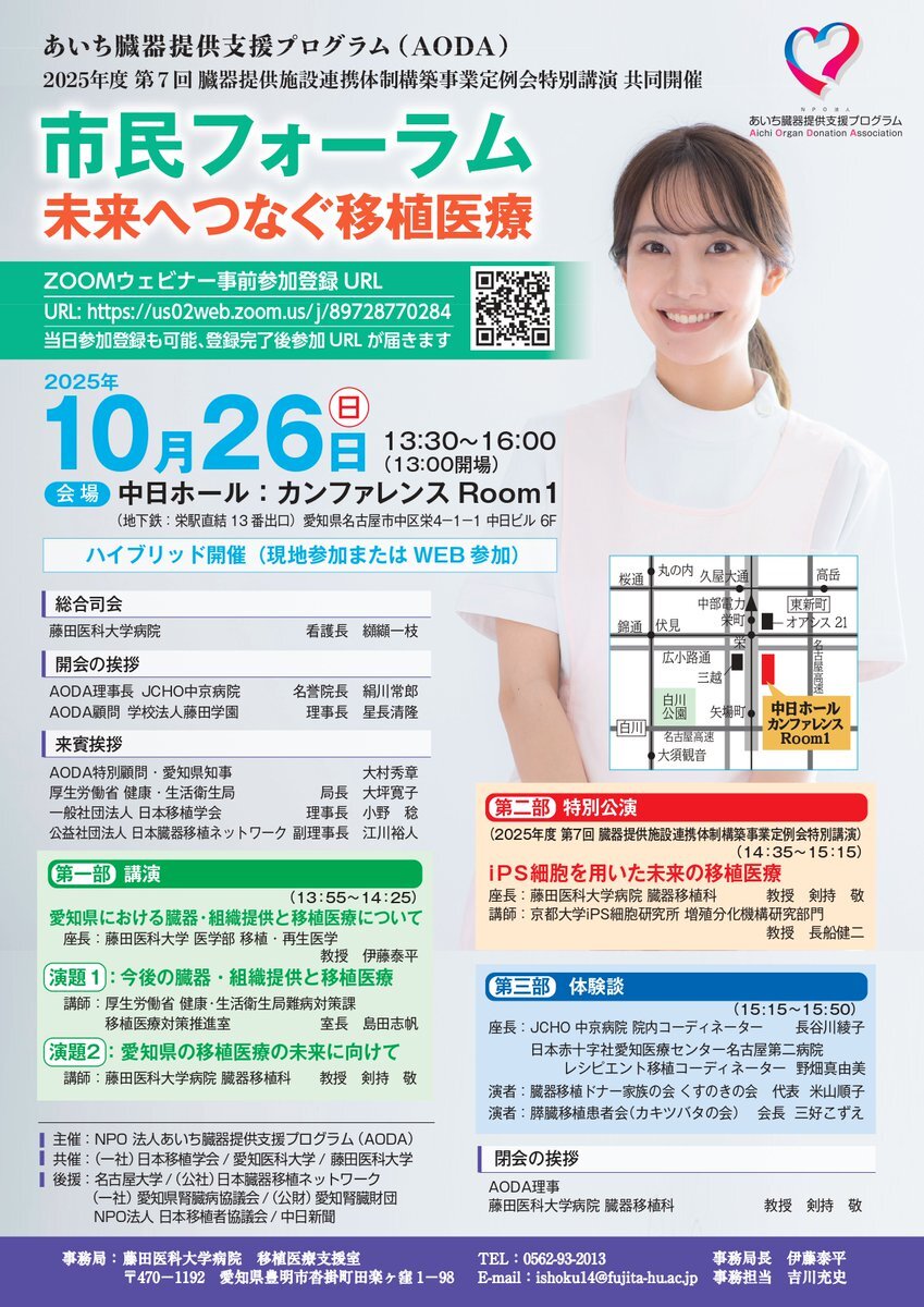 <お知らせ> 10月26日㈰ 市民フォーラム「未来へつなぐ移植医療」に #藤田医科大学病院 も参加します。 移植医療の現在、未来についての講演、 臓器移植の体験談などを聴くことができる 貴重な機会です。 会場:中日ホール ぜひご参加ください。 くわしくはこちら aoda.or.jp/index.html pic.x.com/eKRdbePtWw