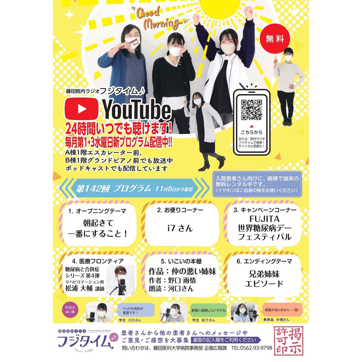 <お知らせ> #院内ラジオ #フジタイム 最新回142回ON AIR♪ 医師、看護師、教職員や #藤田医科大学 の学生も出演! 今回のテーマは 「朝起きて一番にすること」です☺ 第1・3水曜日に配信! YouTubeやポッドキャストで聴けます。 #FHU #藤田医科大学病院 youtube.com/channel/UCpA_U…
