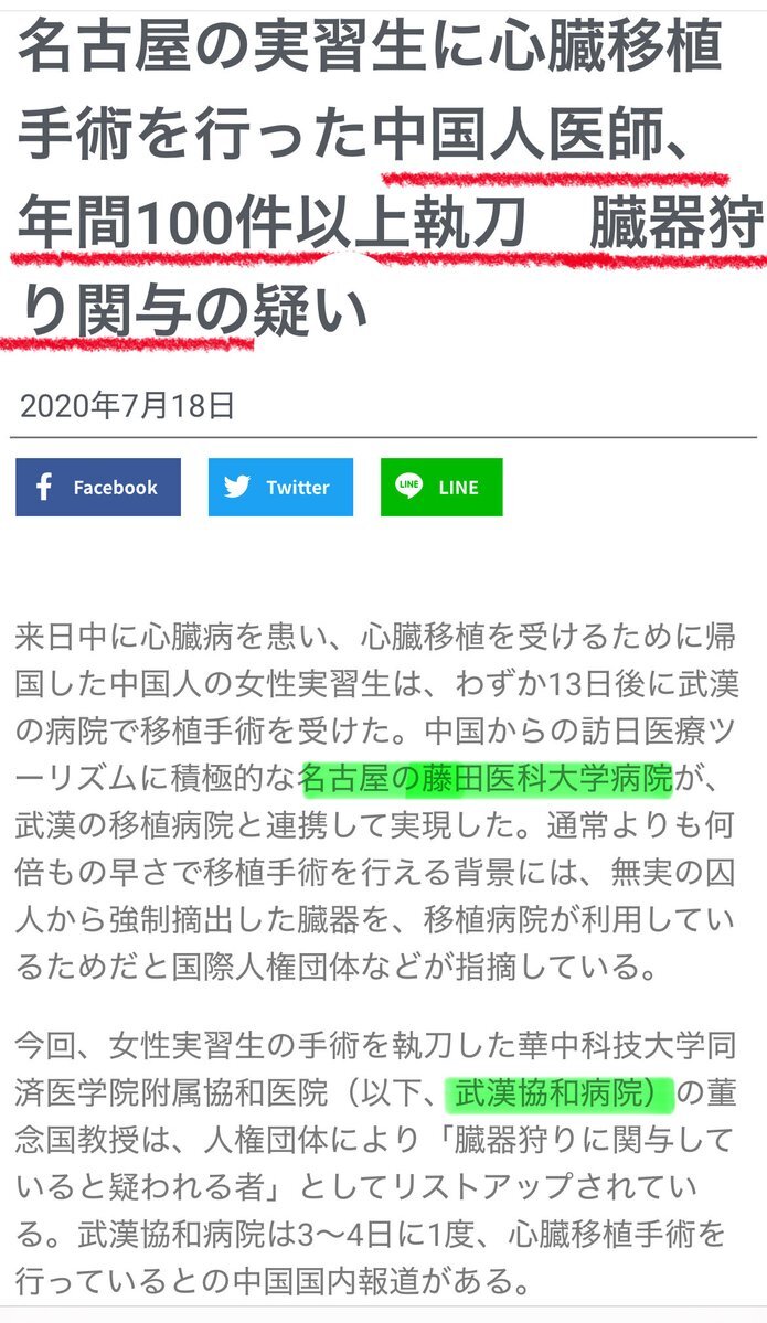 #藤田医科大学病院 と連携してる 🇨🇳武漢協和病院の医師が #臓器狩り⁉️ 武漢🟰アド🩸 来日中に心臓病を患い藤田医科大学病院で治療中の🇨🇳女性 名古屋の中国総領事館の協力で 専用機✈️で帰国 執刀医が #臓器狩り 疑いで人権団体からリストアップ 法輪功やウイグル人から強制摘出疑い 藤田も怪しい pic.x.com/O94ZNakTU4 x.com/ma20221120ma/s…