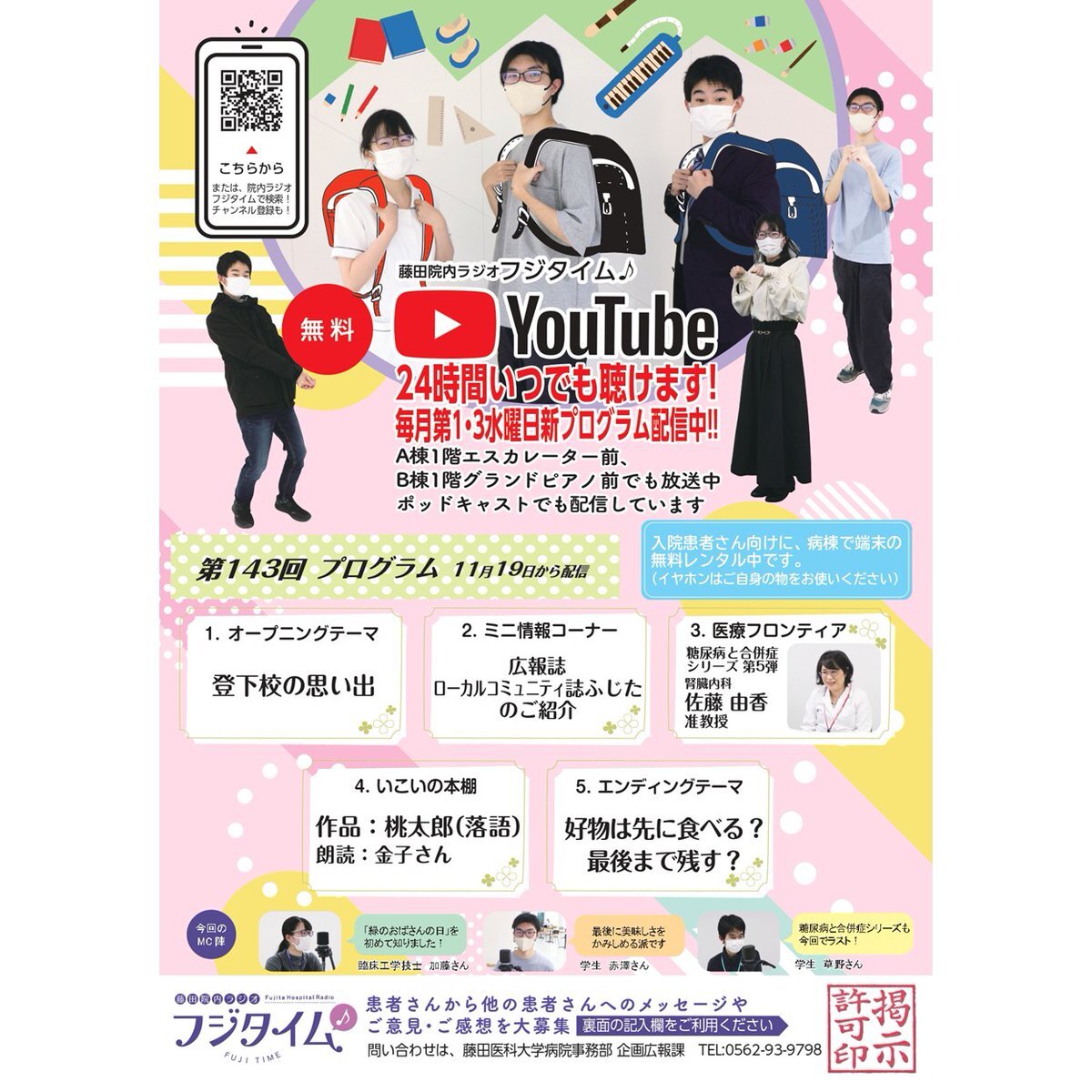 <お知らせ> #院内ラジオ #フジタイム 最新回143回ON AIR♪ 医師、看護師、教職員や #藤田医科大学 の学生も出演! 今回のテーマは「登下校の思い出」です☺ 第1・3水曜日に配信! YouTubeやポッドキャストで聴けます。 #FHU #藤田医科大学病院 youtube.com/channel/UCpA_U…