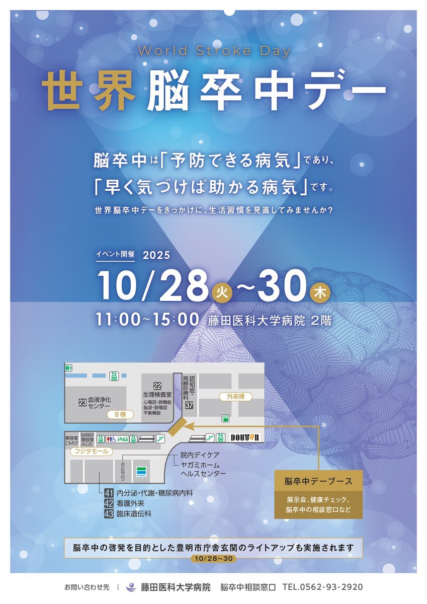 <お知らせ> 10月29日の #世界脳卒中デー にちなみ、 藤田医科大学病院 #脳卒中科 が 28日~30日まで脳卒中予防&啓蒙イベントを開催! 健康チェック、相談窓口、展示などがあります。 お気軽にお立ち寄りください。 【場所】外来棟2F #藤田医科大学病院 pic.x.com/1qxSFj4Z2I