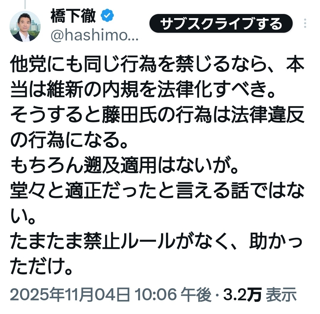 昨夜のいくつかのテレビ局の編集は偏向報道そのもの。悪意か無知かわかりませんが、一般的な商慣習も基礎知識も無視した恣意的な内容。一次情報としての記者会見動画と見比べてもらえる時代。編集のおかしさがわかると思います。 ↓ 維新・藤田氏「今後は発注しない」秘書の会社に“公金”支出 x.com/fumi_fuji/stat…
