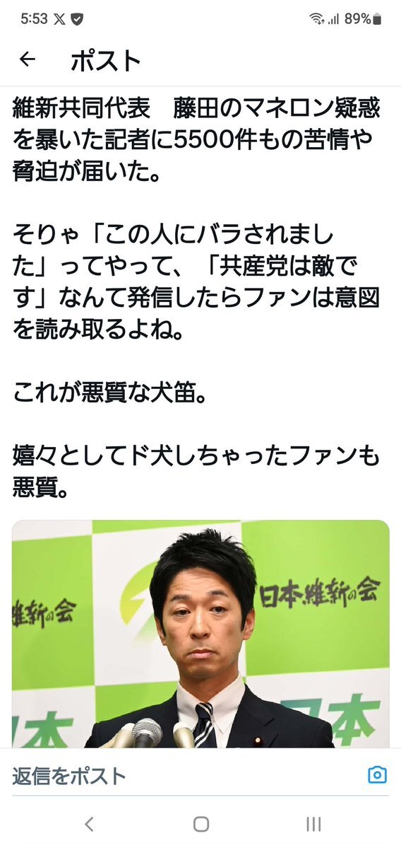 ハイハイ💩判った判った💩ガンバったねん💩おつかれさん🤣 #藤田文武は平気で嘘をつく #藤田文武は政治家失格人間失格 #藤田文武は統一教会 #藤田文武に騙されるな #維新は利権と汚職と税金泥棒 #維新は日本に必要ない政党 #維新は日本国民の敵 #維新傷を舐めあう連立 #維新は暴力団詐欺師犯罪者集団 pic.x.com/zucencNQNJ x.com/fumi_fuji/stat…