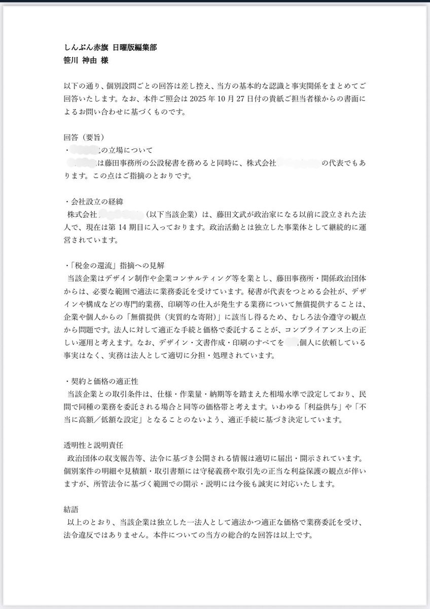 <しんぶん赤旗の記事について> 記事には回答の全文は掲載されないようですので、赤旗さんからの質問状の返答内容を添付画像にて公開します。 ・悪意のある税金環流のような恣意的な記事ですが、すべて実態のある正当な取引であり、専門家にも相談の上で適法に行なっているものです。