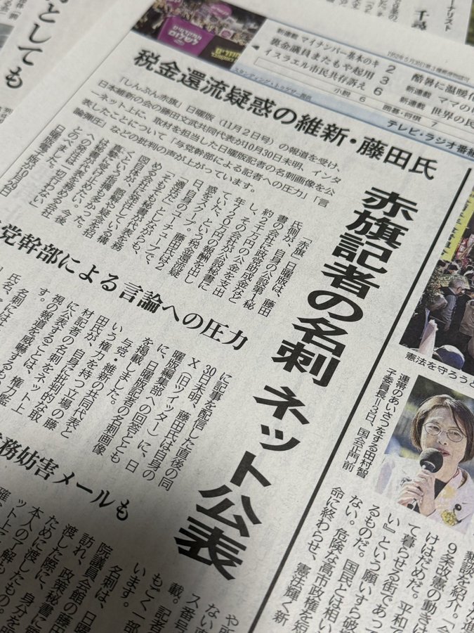 【いま読まれています】維新・藤田文武氏による「嫌がらせ」に失望の声 赤旗記者の名刺をSNSでさらし…立花孝志氏ばりの「犬笛」 tokyo-np.co.jp/article/447272 識者は「赤旗の報道に対する反論が目的なら、名刺画像の投稿は不必要で、記者に対する嫌がらせ目的と疑わざるを得ない」と指摘します。