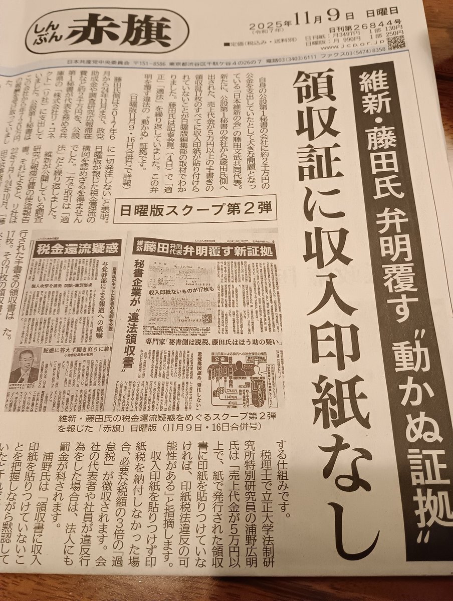 維新・藤田共同代表の税金ロンダリング疑惑に新証拠! 公金2千万円を受けとった秘書企業の領収書 うち17枚には収入印紙が貼ってなかった! コレ、印紙税法違反の可能性アリ 衝撃の事実を赤旗記者が突き止めた それでも「適法」なんですか? 詳しくは #赤旗日曜版電子版 akahata-digital.press/sunday/