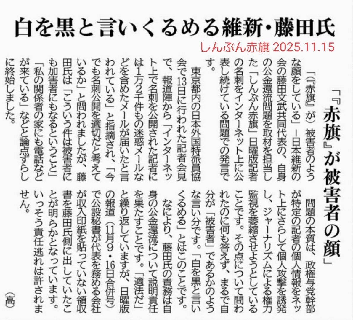 維新・公金還流疑惑 赤旗記者の名刺公表/地方紙社説 相次ぎ批判/「全報道機関に関わる問題」|しんぶん赤旗|日本共産党 jcp.or.jp/akahata/aik25/… #藤田文武名刺さらし問題