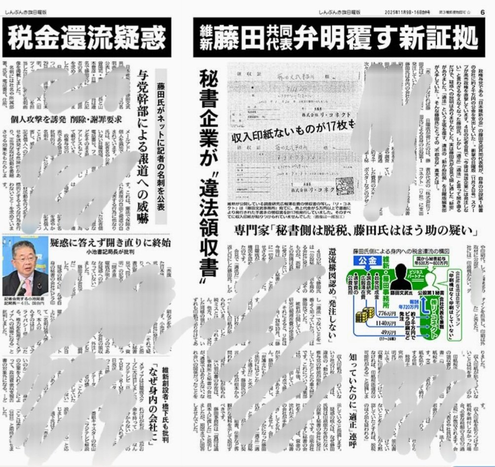 藤田文武維新共同代表は完全にアウト!しんぶん赤旗日曜版スクープ第二弾(2025年11月9日・16日合併号)! #藤田文武税金還流疑惑 #維新はマネーロンダリング政党 #秘書企業が違法領収書 pic.x.com/6tIPCSuAkA