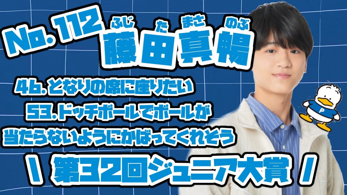 ⭐️Myojo 第3️⃣2️⃣回 #ジュニア大賞 ⭐️ No.112 #藤田真暢 くんを推薦する部門 【53,ドッジボールでボールが当たらないようにかばってくれそう】 誰を書くか悩んでいる方 藤田真暢くんによろしくお願いします🗳💙 ※画像タップ推奨です❕ #Jr大賞うちの子どうですか #ジュニア大賞うちの子どうですか