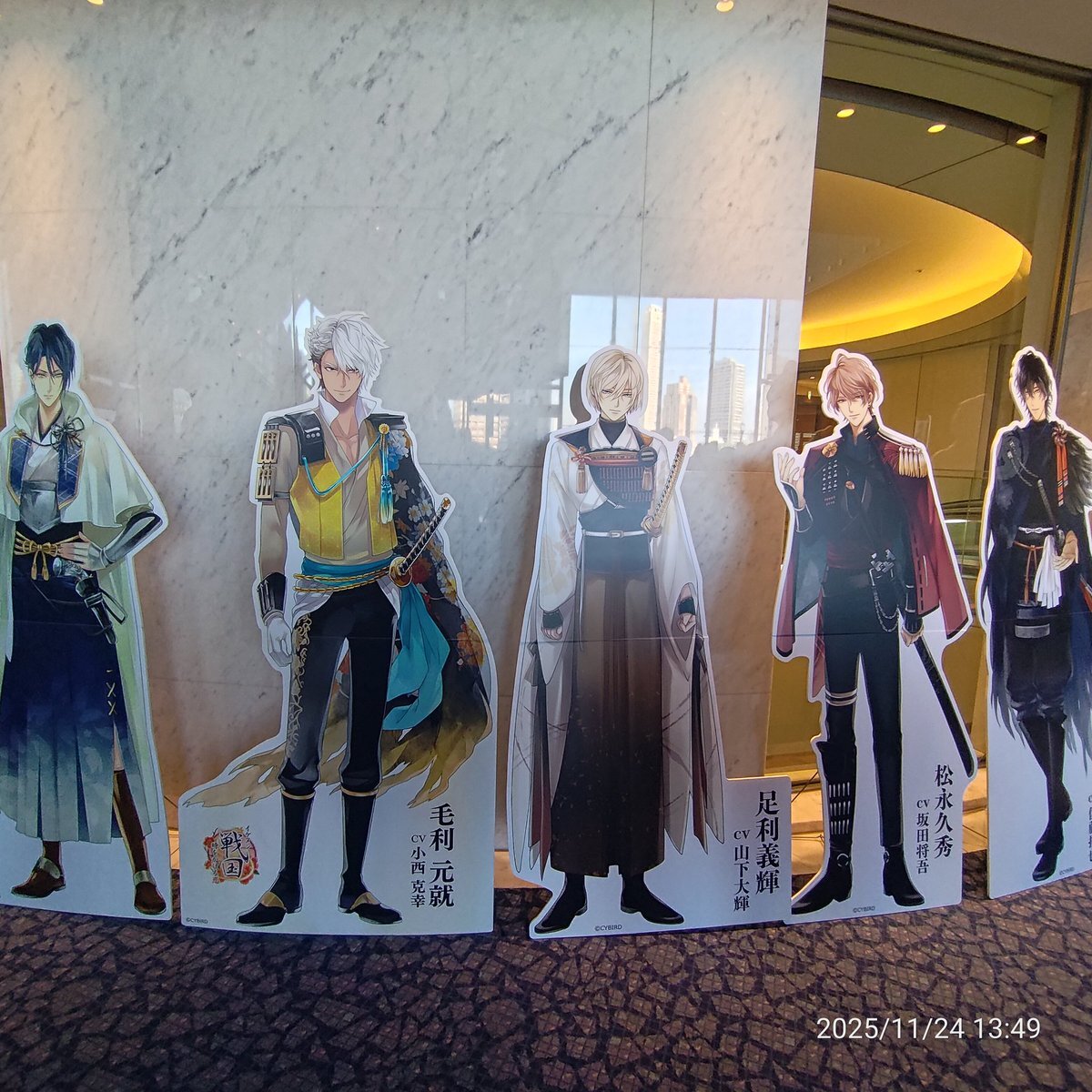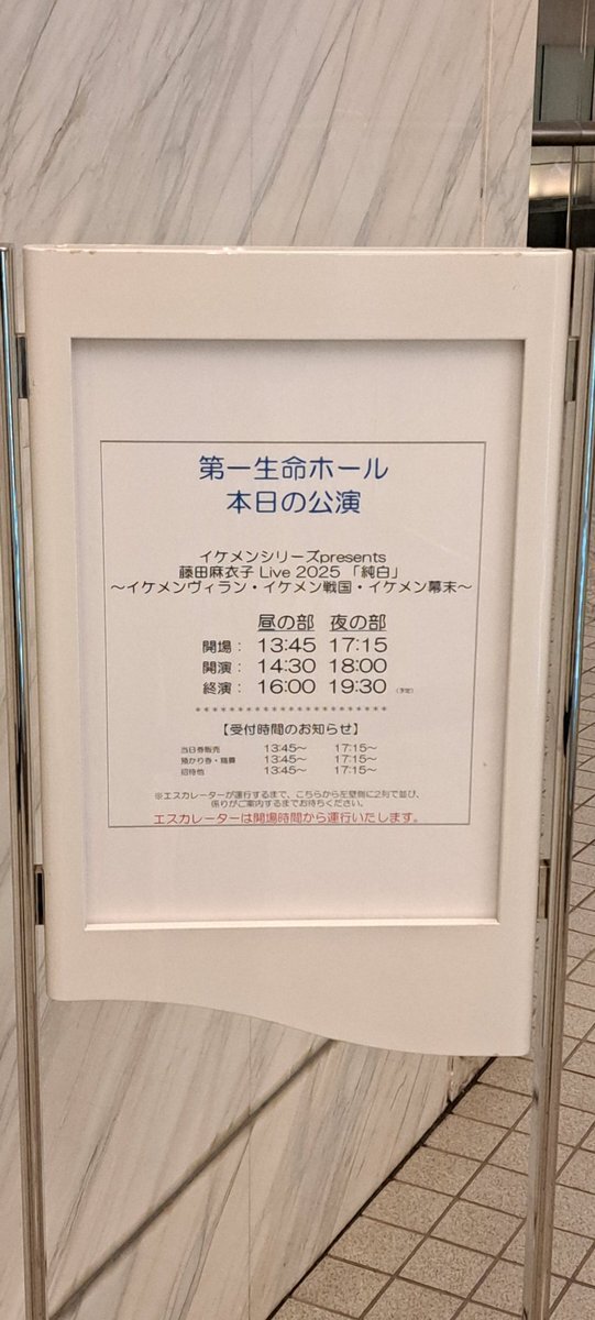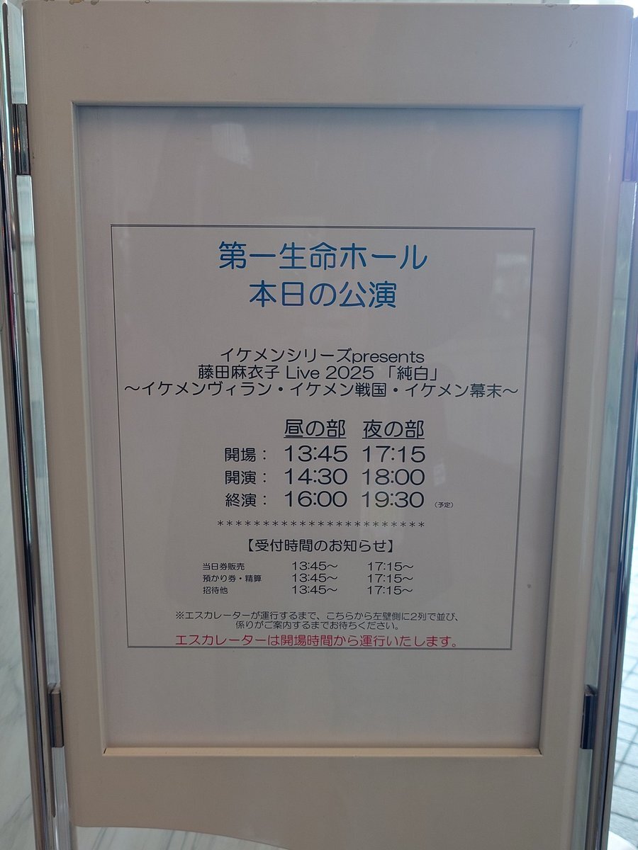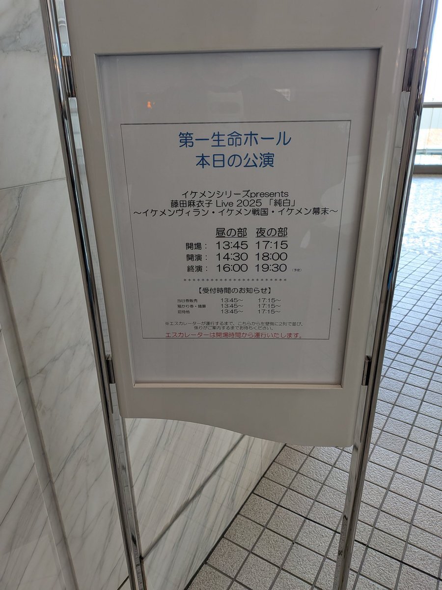 今日は東京第一生命ホールで14:30〜&18:00〜 バンドライブ「純白」です🎻 ペンライトをグッズで作ったのいつぶり…?🤔楽しみましょー😄 会場ロビーで3タイトルのイケメン達の等身大パネル(全51体)もお待ちしてます✨多くて全員写りきらない😂 #イケメン幕末 #イケメン戦国 #イケメンヴィラン x.com/maiko_staff/st…