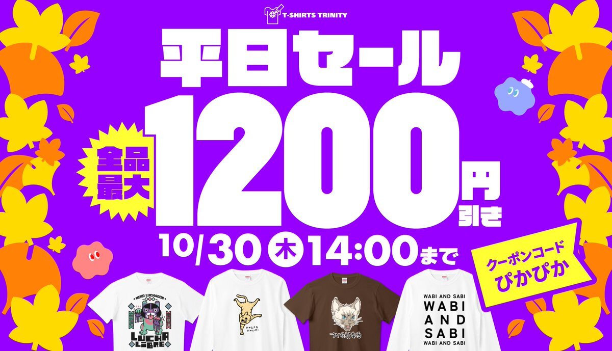 \Tシャツトリニティの平日セール開催‼️🍂 / 全品最大1,200円引き❗️🔥 人気のTシャツをはじめ、ロンT・パーカー・スウェットなど、 これからの季節にぴったりなアイテムがお買い得🌟 全品お得に買えるチャンス❗️お見逃しなく👀 ⏰開催期間 2025年10月29日(水)14:00 〜 10月30日(木)14:00