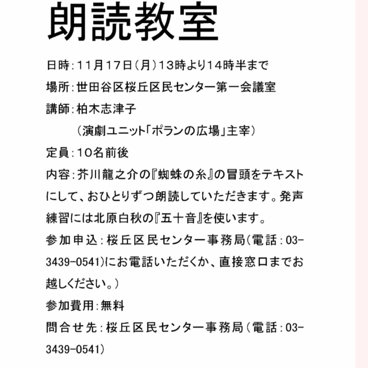 🌸おかげさまで定員をこえるお申し込みがありました🌸 お申し込みいただきました皆さま、お気にかけていただきました皆さま、ありがとうございました。 #朗読教室 #桜丘区民センター #蜘蛛の糸 #芥川龍之介 #五十音 #北原白秋 #演劇ユニットポランの広場 pic.x.com/k1TKabyfFr