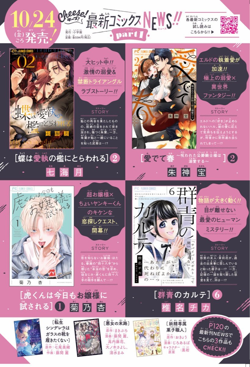 \#チーズ12月号/ 💜本日発売💜 ⭐️表紙&巻頭カラー 『#愛でて春〜呪われた公爵騎士様は溺愛する〜』朱神宝 大人気‼︎超溺愛編スタート💜 ⭐️カラー 『#蝶は愛執の檻にとらわれる』七海月 ‼️コミックシーモアみんなが選ぶ2026電子コミック大賞エントリー作品‼️ ついに運命の三人が……! pic.x.com/uyhgtySMNJ