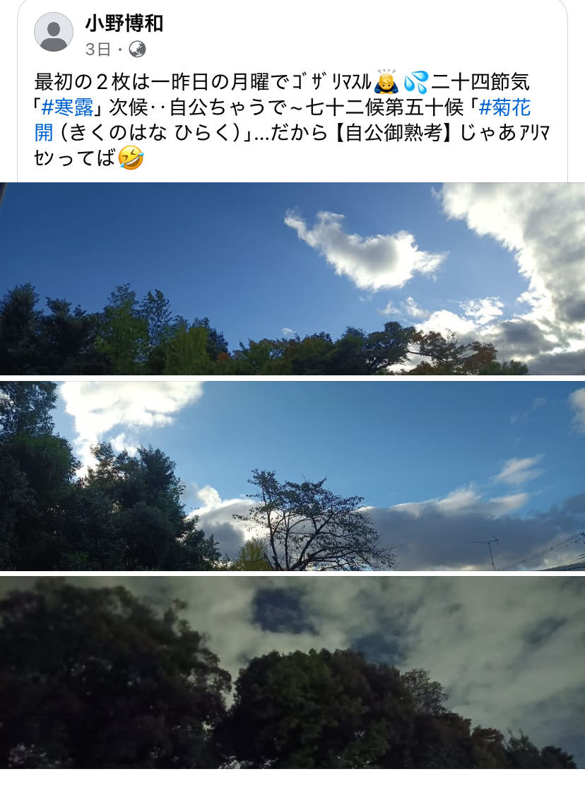 返信先:@tachirayamaアリャ?‥お知らせが遅れたかはたまた見落とし(ダケ)か⁈(おおかた後者か😅)…あの直後「雨」で半袖半ズボン好都合だったカモむしろ🤣昨日18日から二十四節気 #寒露 末候(=七十二候第五十一候)#蟋蟀在戸(きりぎりすとにあり)一昨日10/17まで(寒露次候七十二候第五十候 #菊花開(きくのはな ひらく)🙇‍♂️ pic.x.com/N4vbAlR4un