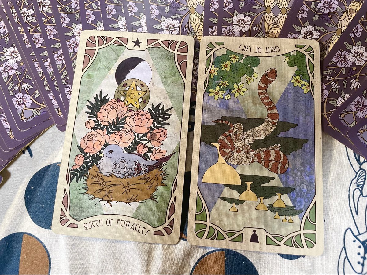 #七十二候のタロットワーク #蟋蟀在戸 きりぎりすとにあり 1.きりぎりす:コインの女王 2.戸:カップの8 逆位置 満足そうに巣の中に座っている土鳩を見ると、『詩経』にある様に、キリギリスは「10月は寝床にいる」ようですね。 戸のカップの8、正位置では、脱皮してその場を去ろうとする蛇 pic.x.com/fkm7NGNeI1 x.com/tazn246/status…