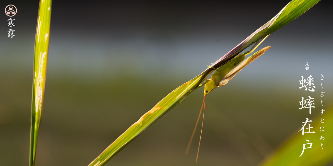 蟋蟀在戸/きりぎりすとにあり 蟋蟀が戸口でなく頃。この候の蟋蟀は、夏から冬にかけて見られ、鈴のような音色を響かせるツヅレサセコオロギだと言われています。ギーッチョンと機織りのように鳴く蟋蟀ではありません。 #二十四節気七十二候 # #蟋蟀在戸