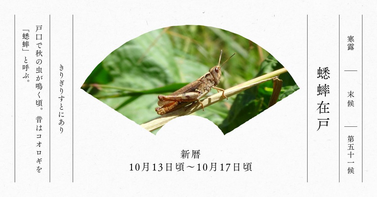 おはようございます! 10/18〜22頃は、七十二候での蟋蟀在戸(きりぎりすとにあり)です🐛 キリギリス(昔はコオロギなど秋の虫の総称として使っていた言葉)が戸口で鳴き始める季節。少し前は半袖で出社してましたが、そろそろ肌寒くなってきましたね🦗 #蟋蟀在戸 #企業公式相互フォロー pic.x.com/bNjkzJmJiK