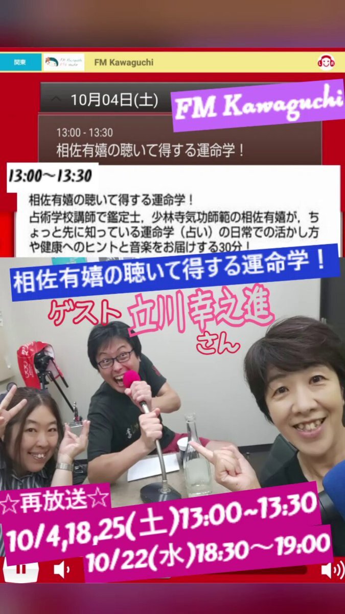明後日10/4は、10月最初の土曜日❣ #FMKawaguchi にて13:00~ 【#相佐有嬉の聴いて得する運命学❣】 🔷秋の“気”が充分に働けないことで不調…その緩和策 🔷ゲスト:#立川幸之進 師匠 ▶メッセージ📧pg@fm856.co.jp ※募集テーマ:推活、秋の予定、フツオタ、相佐への質問