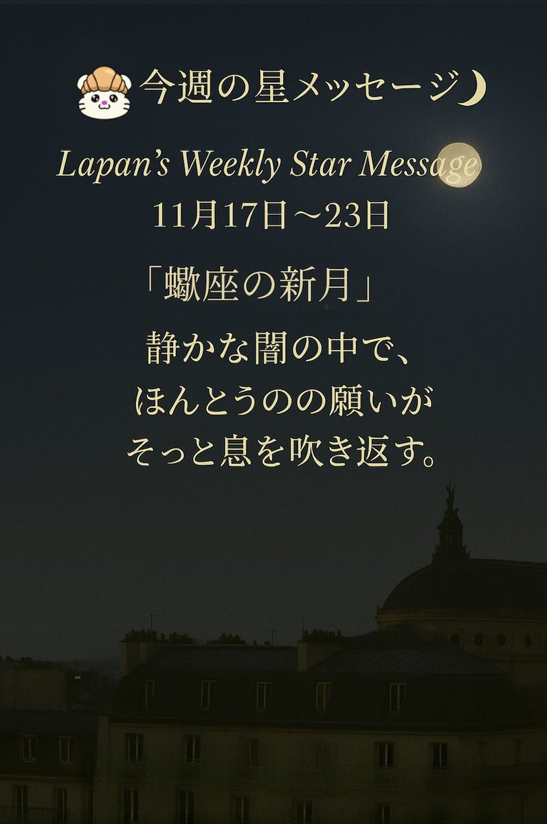 今週は「蠍座の新月」。 静かな闇の中で、 止まっていた願いがそっと息を吹き返すとき。 焦らず、深く、静かに。 “ほんとうの望み” に光が戻ってくる週。 — Lapan 🐰✨ #蠍座の新月 #今週の星メッセージ #ラパンの星読み #ScorpioNewMoon #AstrologyMessage pic.x.com/bmJiqvJLmH