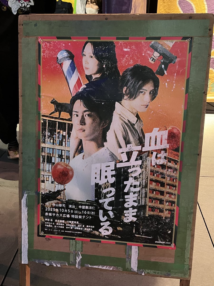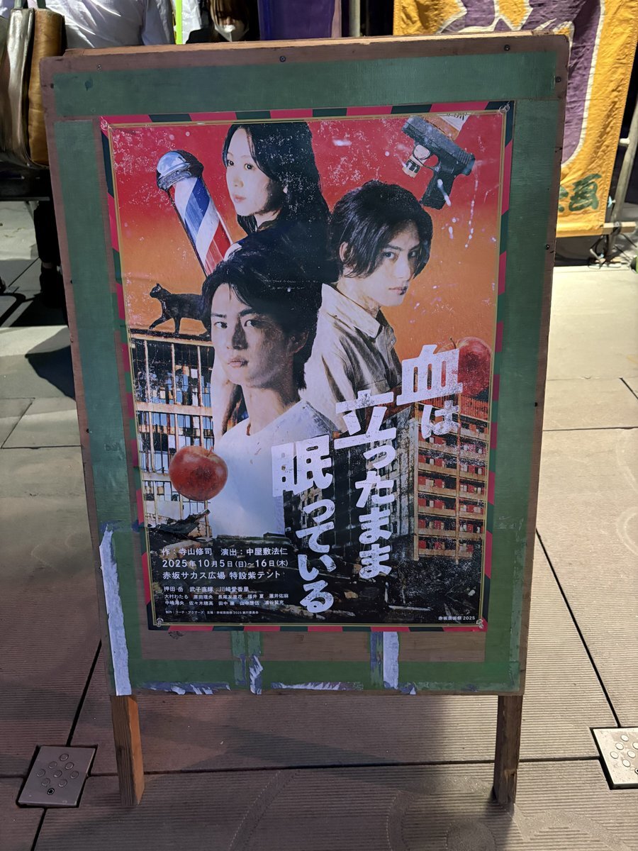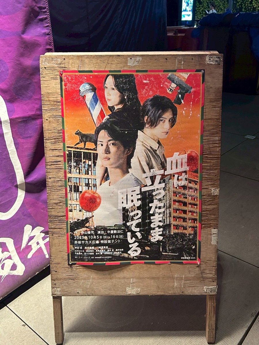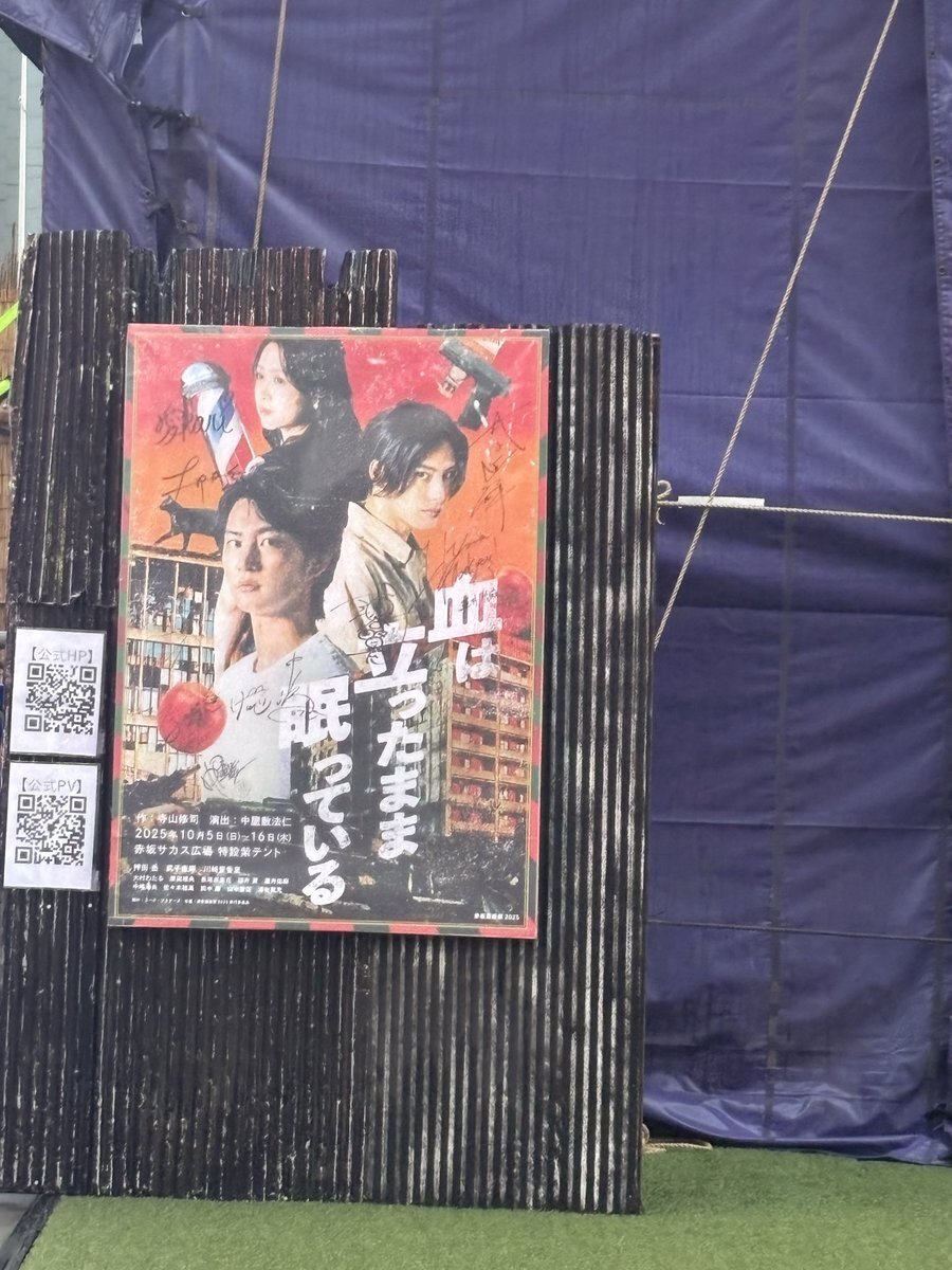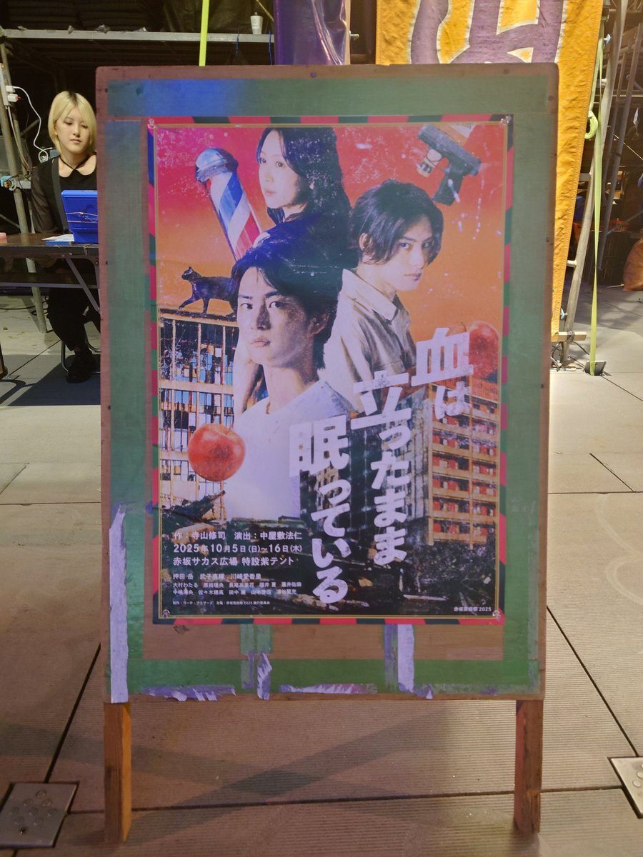 本日3日目!!! 今宵も我々と共に 赤坂の街で赤色に 染まろうではありませんか。 キャストの直筆サイン入りパネルも ぜひご覧ください! #赤坂芸術祭2025 #血は立ったまま眠っている #血眠2025 pic.x.com/w824gSQ8Ww