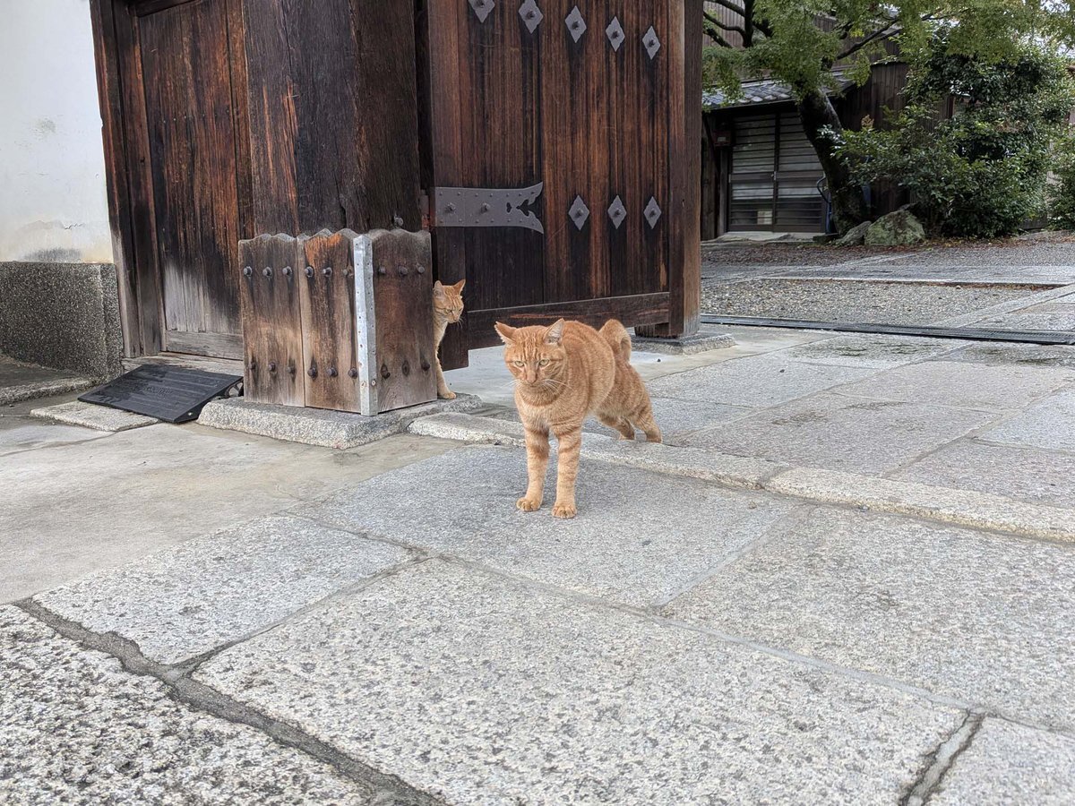 三十三間堂の東隣、養源院の前を通ると、猫の親子が寄ってきました。 茶トラの8割はオス。メスは珍しい。 ちなみに養源院は血天井が有名。 伏見城内で自害した徳川方の兵を弔い、血でそまった廊下の板を天井板に。 #京都 # #茶トラ #血天井 pic.x.com/hJ1iWdmFvl