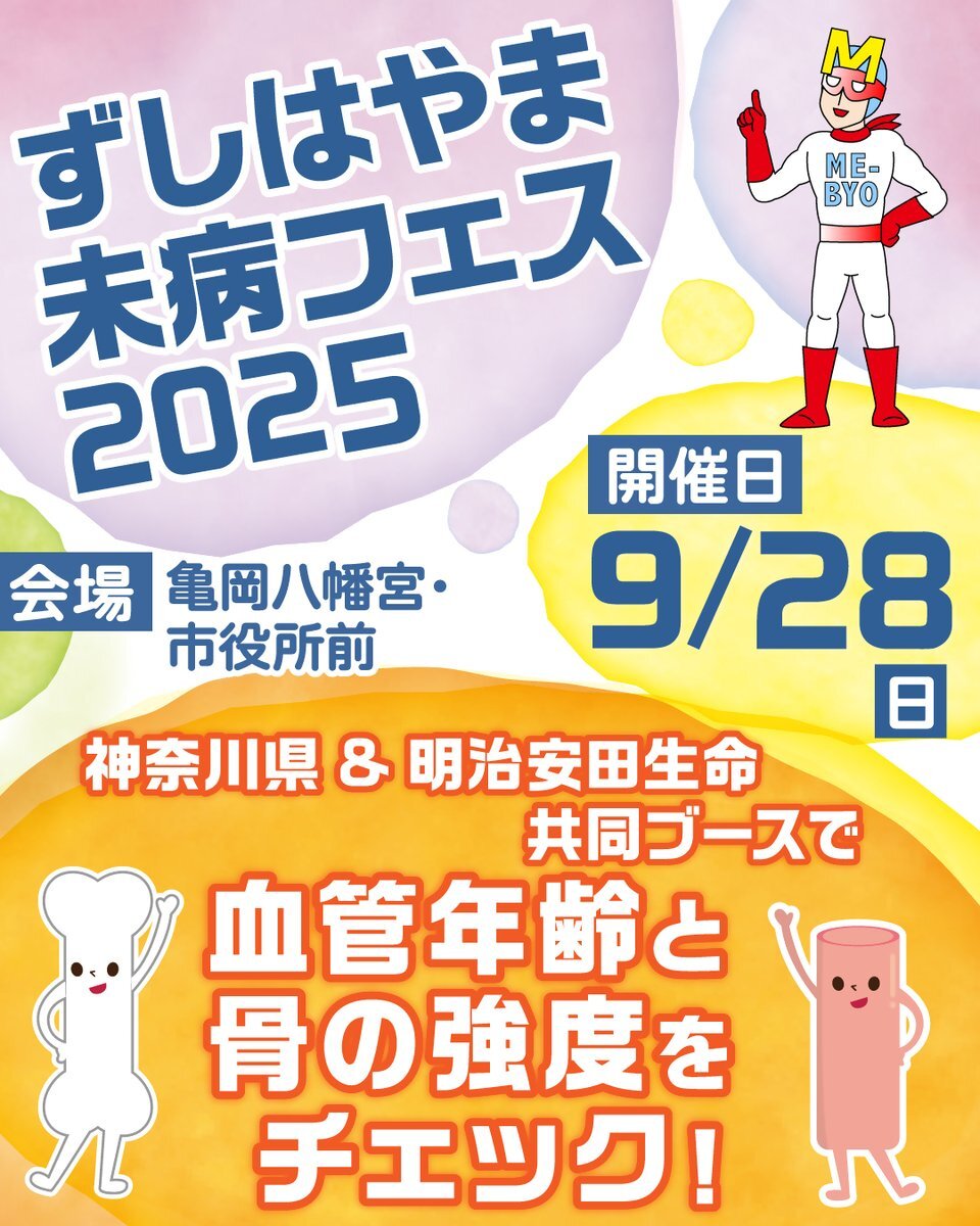 #ずしはやま未病フェス 9月28日(日曜)10時から16時開催】 会場は亀岡八幡宮・市役所前。未病のことを知って体験して #未病改善 スイッチを入れよう。神奈川県のブースでは #血管年齢 と骨の強度がチェックできるぞ!ステージやグッズ販売、キッチンカーなど盛りだくさん。ぜひ行ってみよう。 pic.x.com/VF1losx9HX