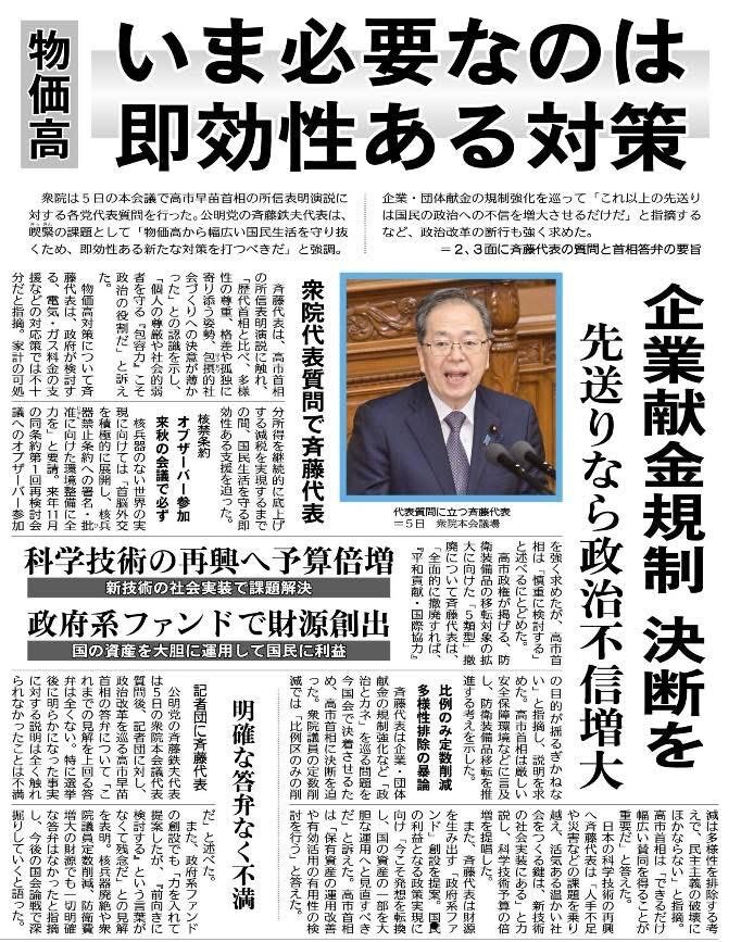 衆議院代表質問❗️ 公明党 斉藤鉄夫 代表 ‼️ ・物価高対策 ・企業献金規制 ・科学技術の再興へ 野党なのに与党並みの責任感を感じます‼️ #衆議院代表質問 #斉藤鉄夫 #物価高対策 pic.x.com/yHmfxuLkA4