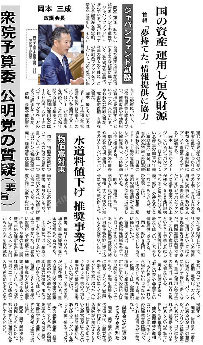 資産運用で財源創出/ジャパンファンドへ技術・人材を結集/衆院予算委で岡本政調会長、中野、山崎氏 #公明新聞電子版 2025年11月12日付