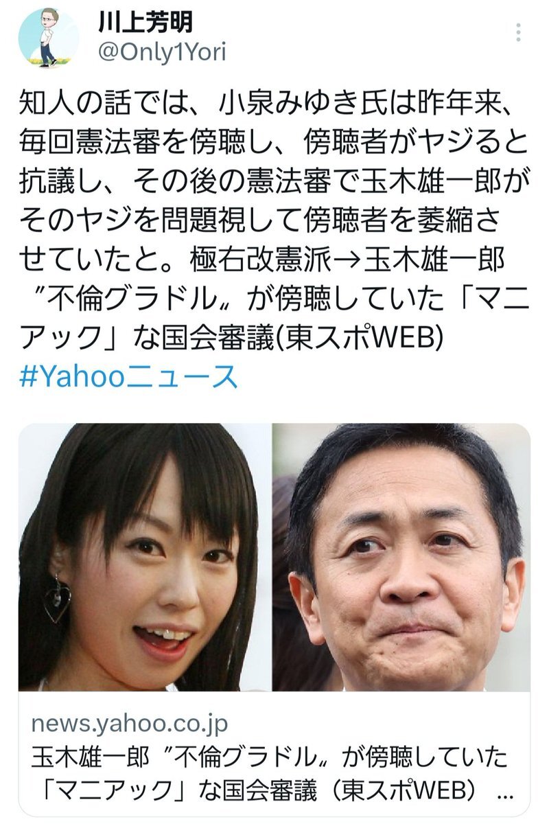 やはり!#衆院憲法審査会 を毎回傍聴していた私の知人の話とも合致するね!#玉木雄一郎 と #小泉みゆき がタッグで護憲派の傍聴者を威圧し、憲法審での改憲論議を盛り上げようとしていたわけだ。とんでもないな、こいつらは😠敬称略 pic.x.com/ZllCmRwOKs x.com/shukan_bunshun…