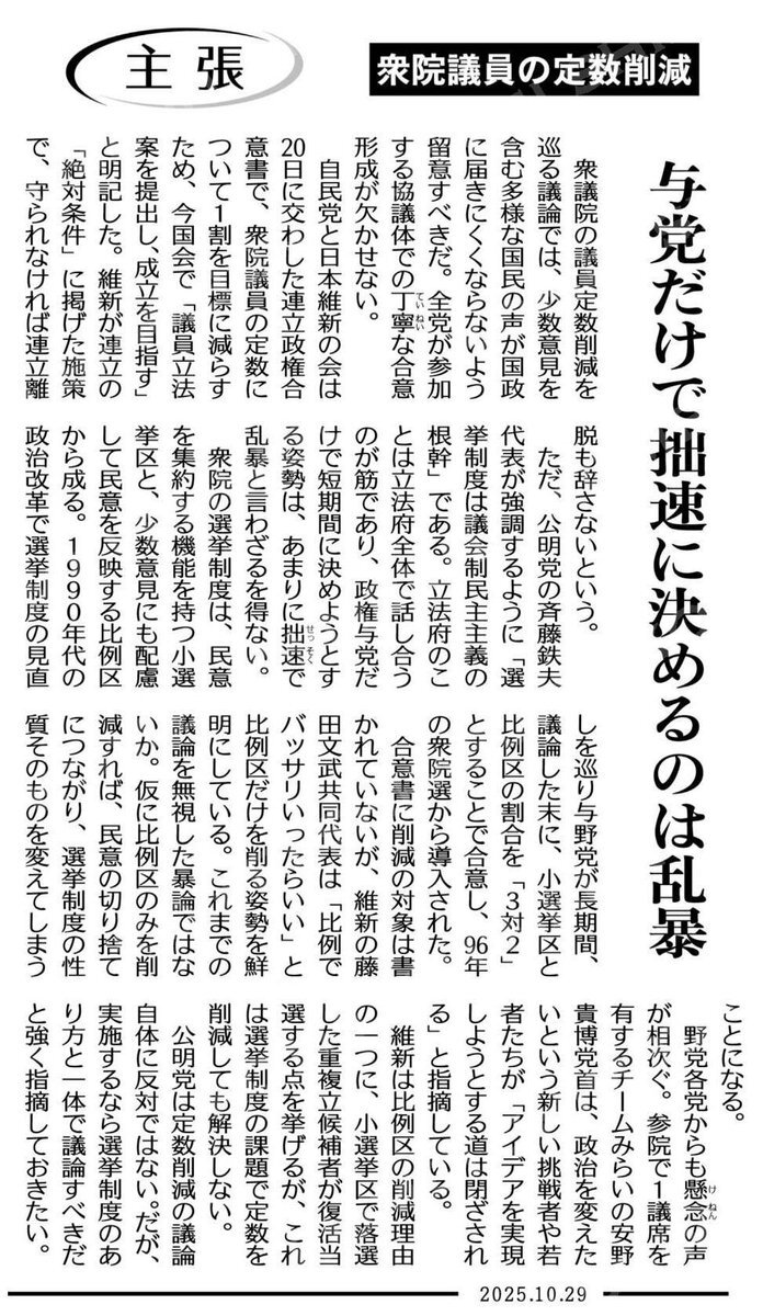 📎公明党は定数削減の議論自体に反対ではない。しかし実施するなら選挙制度のあり方と一体で議論すべきだと強く指摘。 #衆院議員の定数削減 #与党だけで拙速に決めるのは乱暴 pic.x.com/dwp0ialvAf