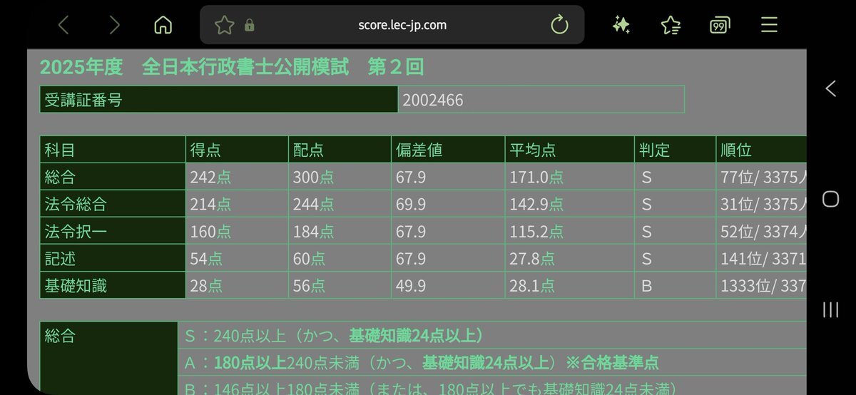 LECのヤマ当て模試。 記述無しで合格点は確保できたが、今年の模試のなかで民法が一番最低点数でした。3問間違えた。 まだまだ時間はある。凹んでいる暇はない。頑張ろ。 #行政書士試験 #行政書士試験受験生 #行政書士受験生 #行政書士 #行政書士試験受験生2025