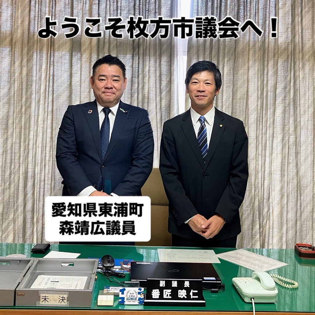 今朝は、愛知県東浦町議会から行政視察にて枚方市役所に📚 森靖広議員は、4年程前に、富士社会教育センターで講師を頼まれた時の受講生。 ともに社会を明るくしましょう❗️ ありがとうございました。 #枚方市 #枚方市議会 #東浦町議会 #東浦町 #行政視察 pic.x.com/GG3oTXA66h