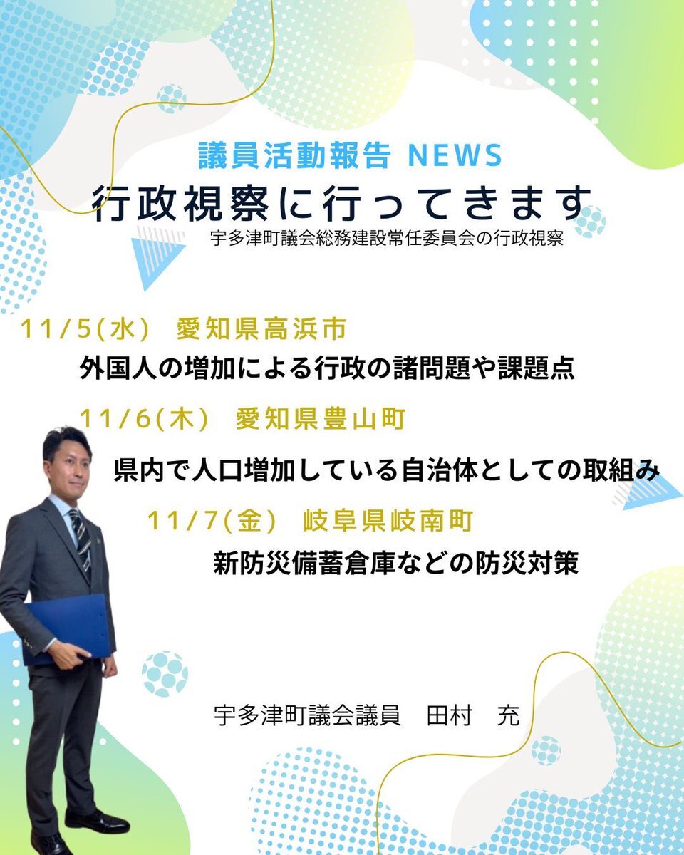 令和7年11月4日(火)〜6日(木) 厚生文教委員会行政視察 ・岡山県奈義町(少子化対策) ・鳥取県倉吉市(脱炭素事業) ・兵庫県三木市(小中一貫校) 3市町にて視察をおこないました。今後の山県市に活用できないか当てはめながら説明をお聞きしました。 #山県市 #行政視察 #奈義町 #倉吉市 #三木市 pic.x.com/uZzSlEstOB