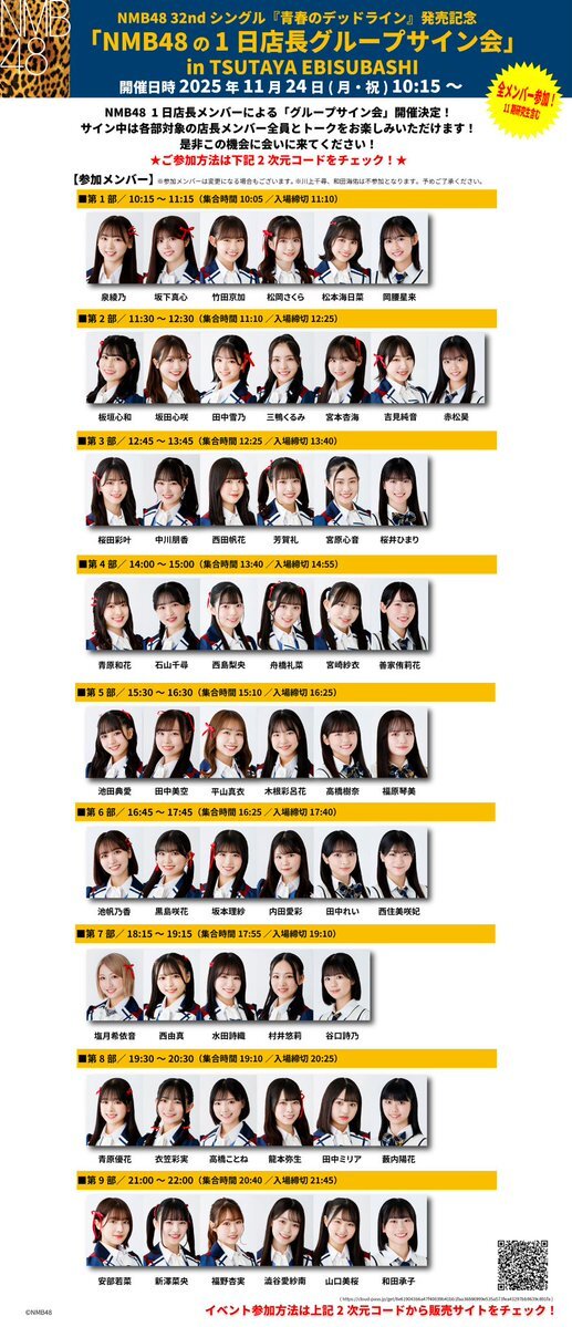 【 イベント情報 】 11/24(月祝) #NMB48 (@nmb48_official) 32nd Single「青春のデッドライン」発売記念 「NMB48の1日店長グループサイン会 in TSUTAYA EBISUBASHI」 開催決定🎉 #エビツタ 店長たちと楽しい時間を過ごしましょう✨ 詳細はこちら🔽 ameblo.jp/tsutaya-4900/e… @nmb48_official