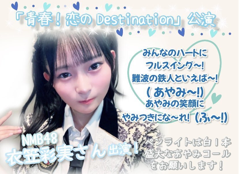 🎧あやみ出演情報🎧 本日11/21(金) 🤍18:30〜 青春! #恋のDestination公演 に #衣笠彩実 さん出演✨ ペンライトは白1本🤍 盛大な\あやみ/ コールをお願いします❤️🔥 #NMB48 pic.x.com/1SPjiE9jOf