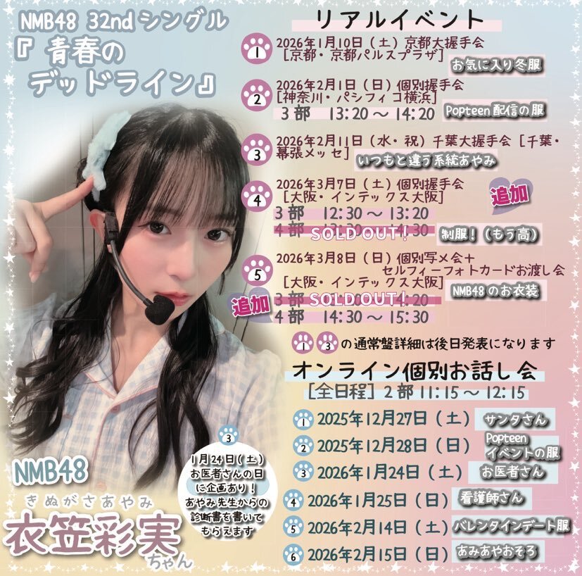 #NMB48 32nd single #青春のデッドライン 発売記念ベント第8次受付中! 本日11/ 21 15:00まで めっちゃ楽舞友公演の出演も決まり生誕祭も間近! イベントの頃は彩実ちゃんにとっても中学卒業、高校入学の節目✨ 彩実ちゃんと2人でいっぱいお話しをしませんか? store-annex.universal-music.co.jp/event-list #衣笠彩実 pic.x.com/OoHuNTpIfK