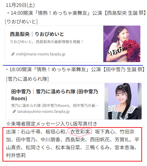 当日お仕事ですが19:30〜なので参加します🥰 17:00のひのとりか仕事ずれこんだら新幹線で会いに行きます💞 9期生でまだお話ししたことがなかったあやみちゃんにとも初めてお話しでます☺️ #青原優花 ちゃん #衣笠彩実 ちゃん pic.x.com/KMDRfXiaFm x.com/t_ebisubashi/s…