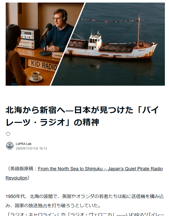 “北海から新宿へ――日本が見つけた『パイレーツ・ラジオ』の精神” 1980年代の“ミニFM”運動が欧州のパイレーツ・ラジオ精神と共鳴していたことを、英語/日本語文脈で読み解きました。 ▶️ note.com/lopra_lab/n/n8… #ミニFM #パイレーツラジオ #メディア文化史 #表現の自由 #市民メディア pic.x.com/Iwa6JmIWTM