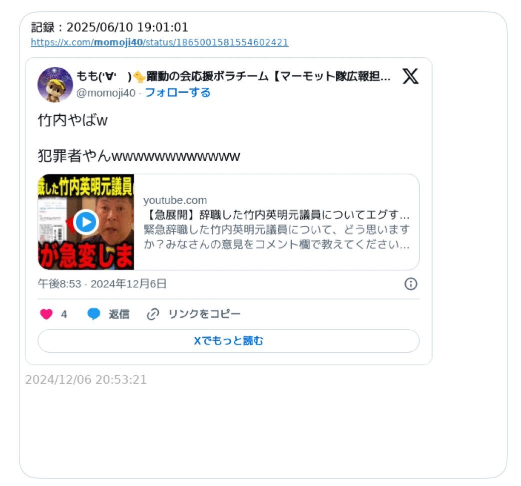 この方も一般人ではありますが、かなり擁護派界隈ではリーダー的存在のももさん。 ただの推し活ではないですよね⁉️ #表現の自由と責任 #斎藤bbaを許さない #立花孝志を司法のもとに #躍動の会は不要 pic.x.com/uZGPmsdubS x.com/n846king/statu…